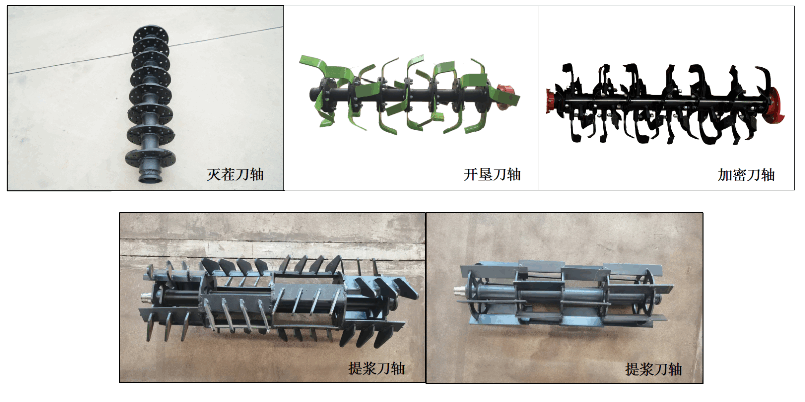 可根據水旱田及農藝需要配制:滅茬刀軸、開墾刀軸、提漿刀軸、加密刀軸