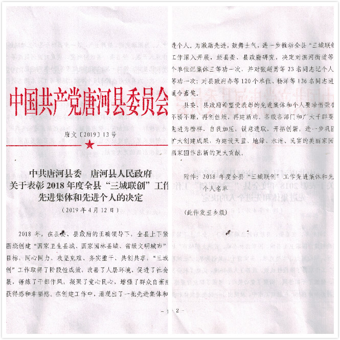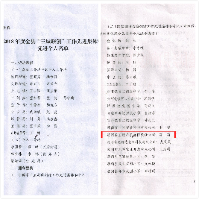 4月12日,唐河縣召開2018年度“三城聯(lián)創(chuàng)”總結(jié)大會。大會宣讀了表彰先進集體及先進個人的決定。亞澳農(nóng)機獲得2018年度國家園林縣城創(chuàng)建工作先進集體。